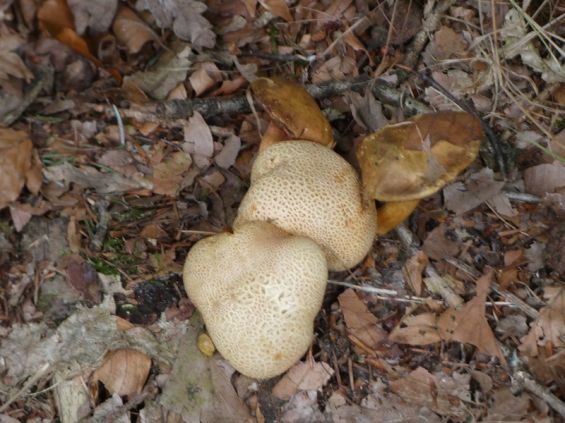 Op dit moment zijn natuurlijk wel paddenstoelen te vinden, zoals Russula’s, Roodbruine Slanke Amaniet (foto), en leuk is de Kostgangersboleet (foto) die te vinden is op of bij de Aardappelbovist .