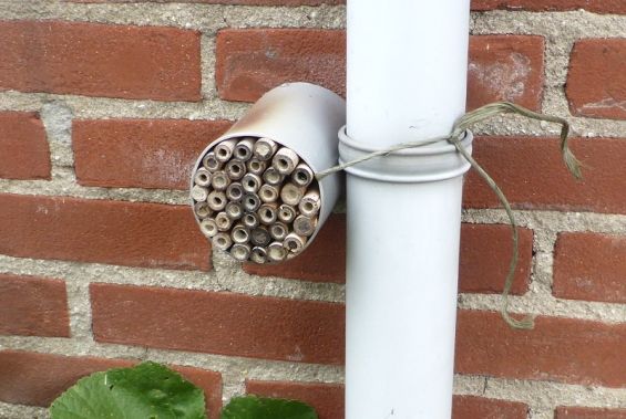 Wat wel te zien is, is een stukje pijp met droge stengels die aan de regenpijp is bevestigd. Een leuk idee voor een eenvoudig insectenverblijf en gemakkelijk te maken.