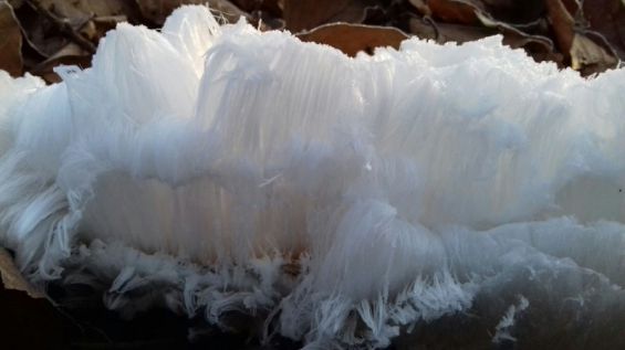 Buiten gekomen bevriezen deze dunne straaltjes water, die net als echt haar dus van onderen aangroeien. De haren op het takje dat ik vond waren tot 5 cm lang, maar de ijsharen kunnen wel 15 of 20 cm lang worden!